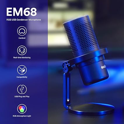GODOX EM68 RGB USB Condenser Microphone, Professional USB Microphone Kit with Foldable Table Stand & Headphone Output, Volume Control, USB Type C with iOS, PC and Mac for Recording, Gaming, YouTube